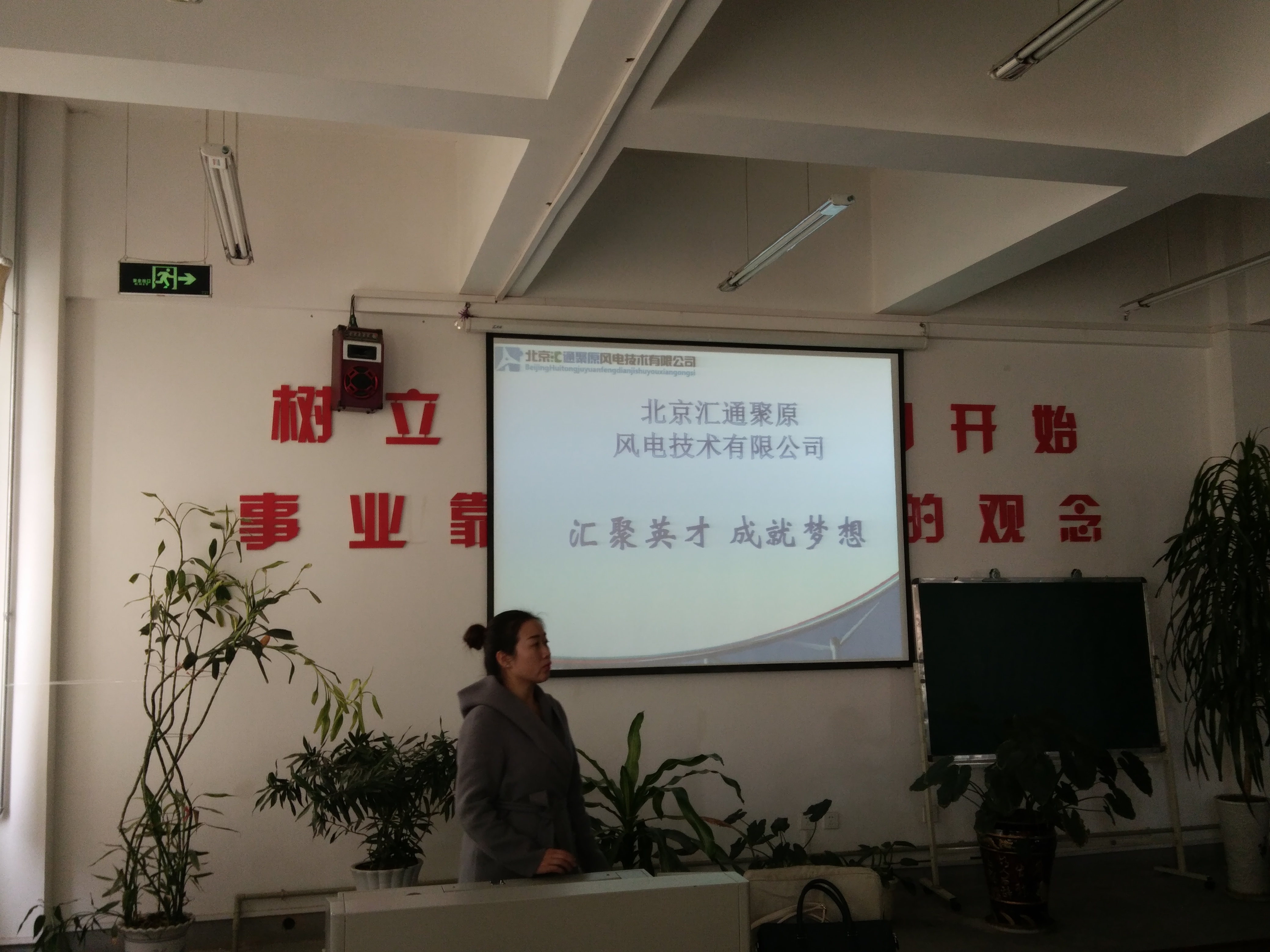 招聘会上,同学们观看了北京汇通聚原风电技术有限公司的宣传片,公司负责人介绍了北京汇通聚原风电技术有限公司总体概况。对本次招聘流程、招聘条件、员工的薪酬待遇、工作环境等做了详细的说明。最后,公司负责人就学生关注的岗前培训及上岗条件做了明确说明,最终有2名学生和北京汇通聚原风电技术有限公司达成初步协议。